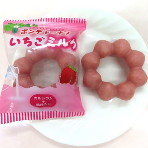 もちもち食感のいちごミルク味のドーナツです。カルシウム、鉄分配合。生地にいちごピューレを配合しています。