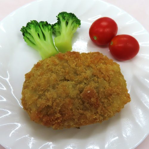 北海道産の南瓜を使用して北海道産の小麦を使った自家製パン粉で包んだコロッケです。南瓜本来の素朴な甘さが特徴です。乳・卵不使用。Fe・Ca強化しています。