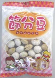 独自製法で食感よく、香ばしく焼き上げた国産大豆(主に北海道産)と、砂糖で輪掛けした大豆をミックスし、食べやすく仕上げました。包装は節分をイメージした、可愛らしいデザインにしています。