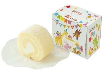 ふんわりやわらかなスポンジに、北海道産の濃厚で口どけの良い純生クリームを44%使用したホイップクリームを巻きました。上面に粉糖をトッピングして仕上げたロールケーキです。小箱にはお祝いをイメージしたデザインを採用しています。※小箱、敷紙、スプーン:紙